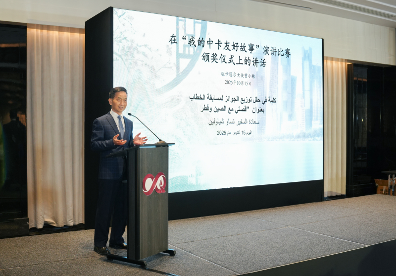 10月15日,曹小林大使出席 “我的中卡友好故事”演讲比赛,现场致辞并为获奖选手颁奖。
