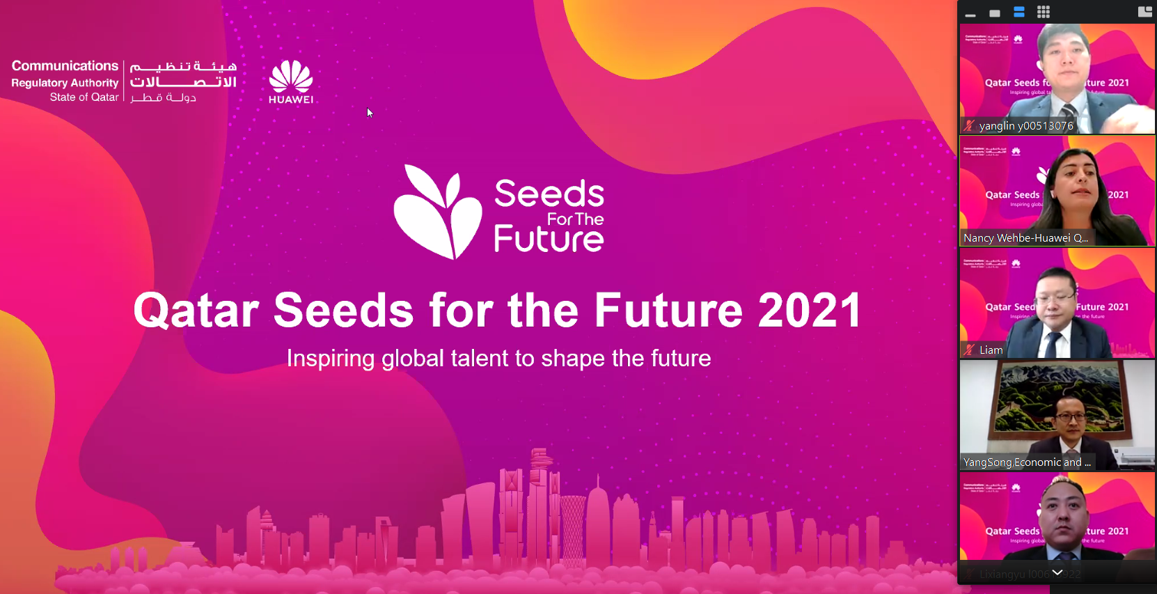 2021年9月1日,驻卡塔尔使馆经商参赞杨松在线出席华为公司2021年“未来种子”项目结业仪式并致辞。华为中东地区副总裁李翔宇、卡塔尔通信监管署和卡塔尔驻中国使馆代表以及卡塔尔大学、哈马德大学的部分优秀学生共40余人出席线上活动。